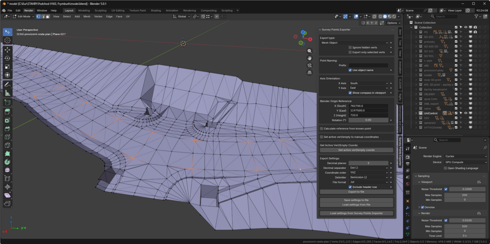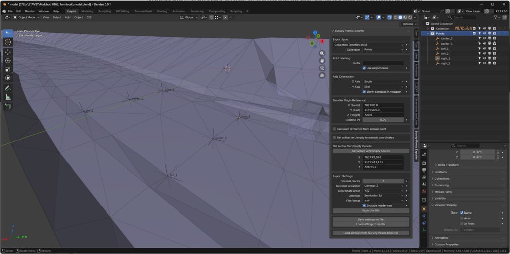 Survey Points Exporter is a professional Blender addon for exporting survey points — mesh vertices and Empty object locations — into real-world coordinates.