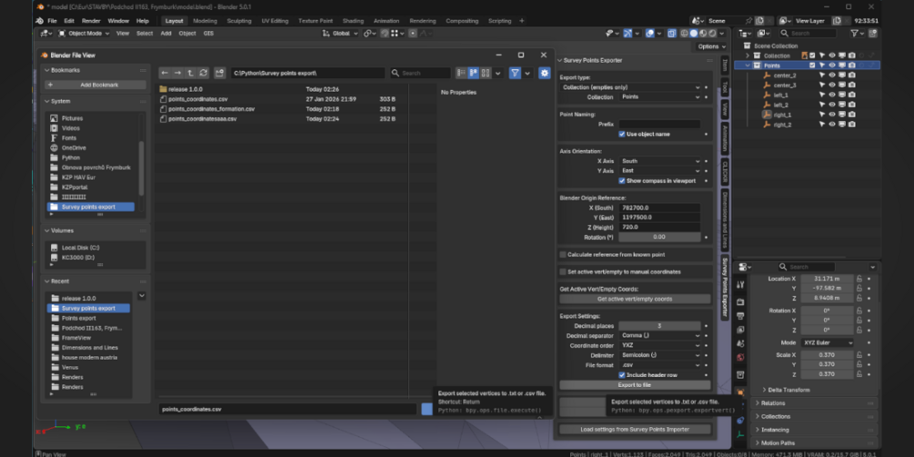 Points Export is a professional Blender add-on for exporting point coordinates from 3D scenes into survey-friendly formats.